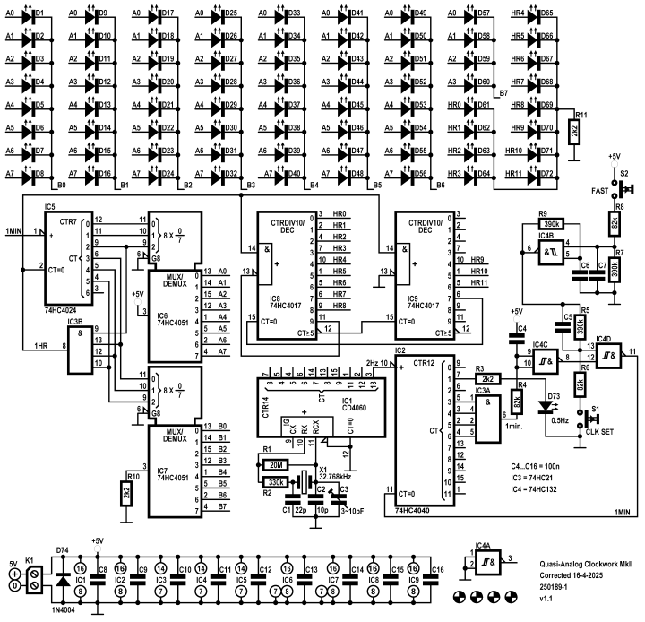 Based on the remake (2024) of classic circuit Quasi-Analogue Clockwork (1995) this MkII version has only 73 LEDs, one minute resolution, a second pushbutton to set the clock faster and the PCB is considerably smaller (80 x 113 mm). Like its predecessors only standard logic is used.