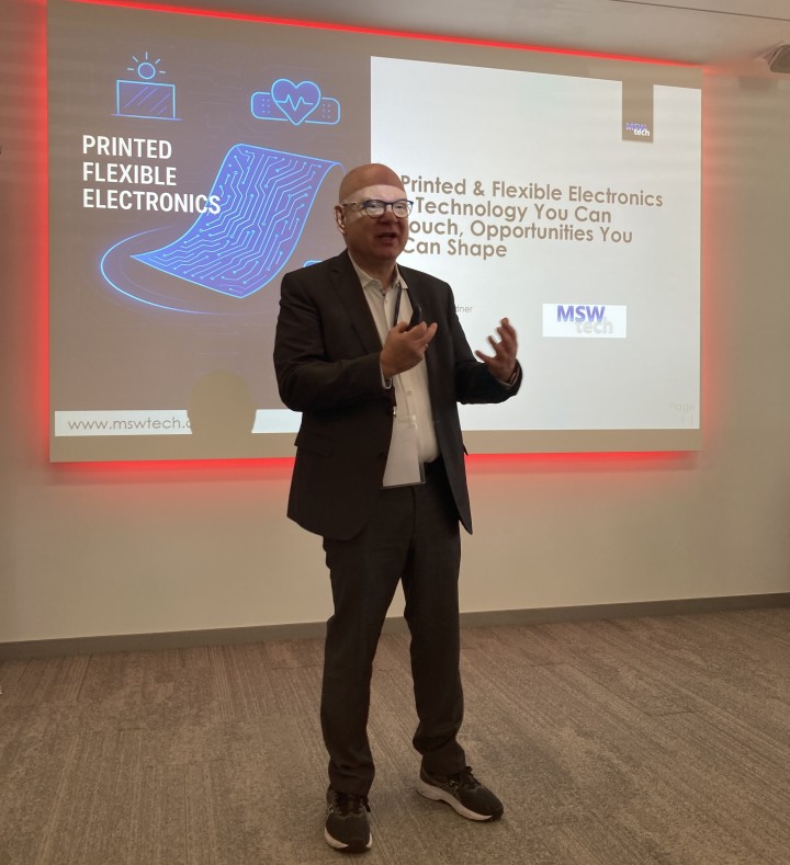Die erste Keynote folgte, präsentiert von Wolfgang Mildner von MSWtech. In seinem Vortrag, Gedruckte & Flexible Elektronik – Technologie zum Anfassen, Chancen zum Gestalten, zeigte er auf, wie gedruckte und flexible Elektronik neue Möglichkeiten eröffnet, Technologie in Alltagsmaterialien und Produkte zu integrieren.